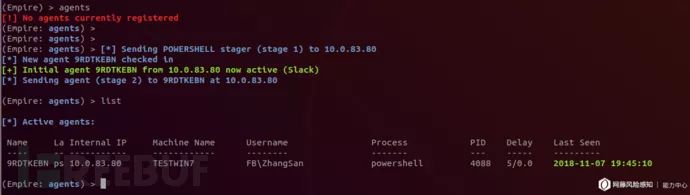 使用empire生成powershell一句话木马,通过Web服务器托管包含该一句话木马的恶意网页。