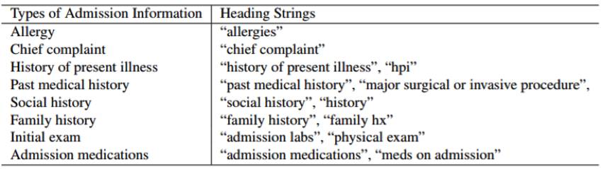 表 1:左栏显示 8 种就诊时可用的信息类型,右栏每行显示了 MIMIC-III 中对应的提取此类信息的标题字符串
