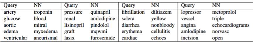 表 3:在单词嵌入空间中一些词(Query)和它在空间中的最近邻(NN)。两个词之间的「相似程度」对应它们的嵌入向量之间的欧式距离。