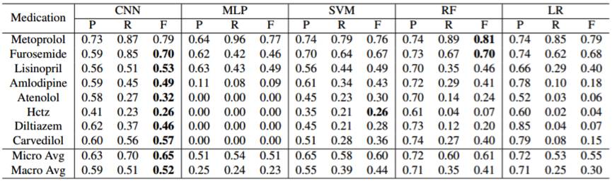 从宏平均和微平均两种 F1 分数上来看,CNN 有远高于其他所有基准模型的准确率。在两种平均 F1 分数之间,CNN 在宏平均上的提升更为显著。CNN 在 7 种药物上都得到了最好的 F1 分数。呋塞米是唯一的例外,其中随机森林(RF)的表现优于 CNN。CNN 相对于基准的提升主要体现在召回率(recall)上,而其准确率则与基准模型相当。在各类基准模型中,只使用就诊药物作为输入的 多层感知机(MLP)在宏平均和微平均 F1 上的表现最差;另外,非线性支撑向量机(SVM)和 RF 的表现优于线性的逻辑回归模型(LR)。