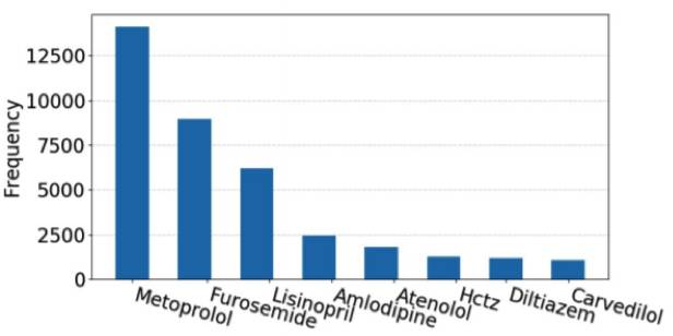 图 1:8 种抗高血压药物在 MIMIC-III 数据集中的频率,Hctz 是氢氯噻嗪的简写
