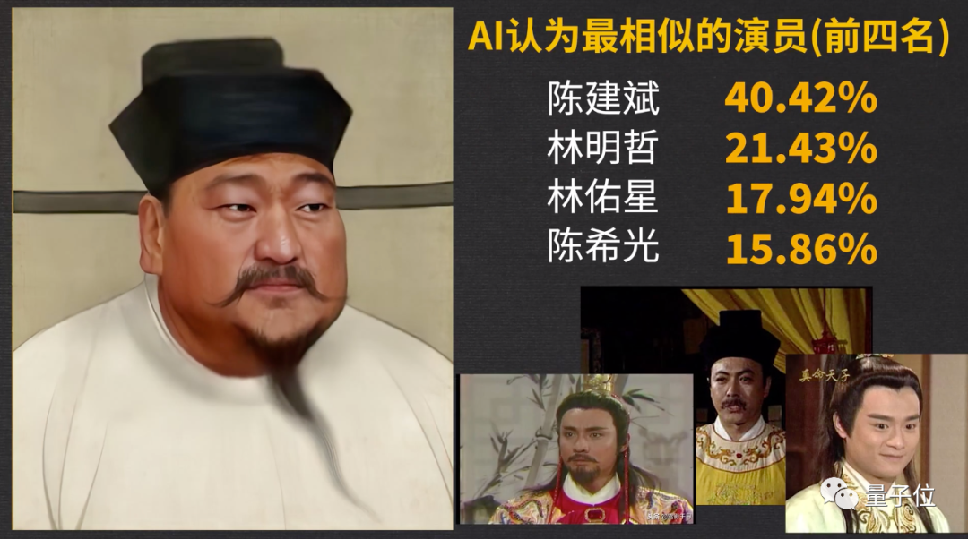 通过比对这些皇帝扮演者的脸部特征,给出一个相似度排名,就可以找到和历史人物最接近的明星脸。