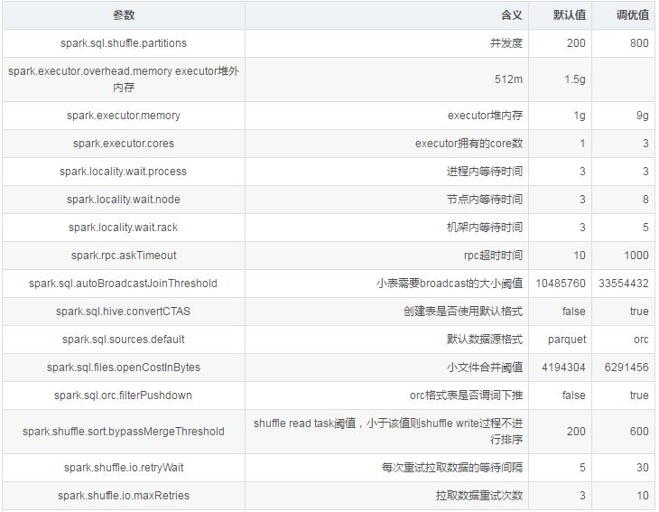 A:调优参数虽名目多样,但最终目的是提高CPU利用率,降低带宽IO,提高缓存命中率,减少数据落盘。 (以下参数主要用于Spark Thriftserver,仅供参考)