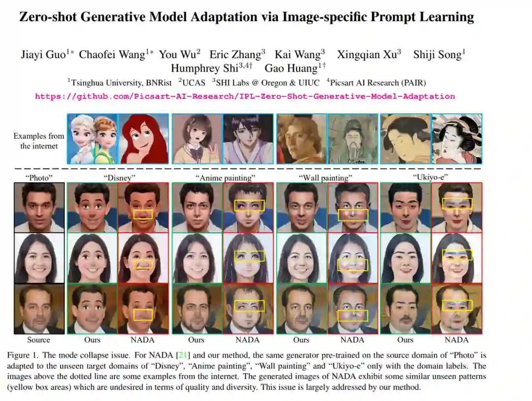 最近,CLIP引导的图像合成在将预训练的源域生成器适应于未见过的目标域方面表现出了诱人的性能。它不需要任何目标域样本,只需要文本域标签。训练是非常高效的,例如,几分钟。然而,现有方法在生成图像的质量方面仍然存在一定的局限性,并且可能会出现模式崩溃的问题。一个关键的原因是对所有的跨域图像对应用固定的自适应方向,从而导致相同的监督信号。为了解决这个问题,本文提出了一种图像特定提示学习(image -specific Prompt Learning, IPL)方法,为每个源域图像学习特定的提示向量。为每个跨域图像对生成一个更精确的自适应方向,使目标域生成器具有更大的灵活性。不同领域的定性和定量评估表明,IPL有效地提高了合成图像的质量和多样性,缓解了模式崩溃。此外,IPL独立于生成模型的结构,如生成对抗网络或扩散模型。代码可以在https://github.com/Picsart-AI-Research/IPLZero-Shot-Generative-Model-Adaptation上找到。