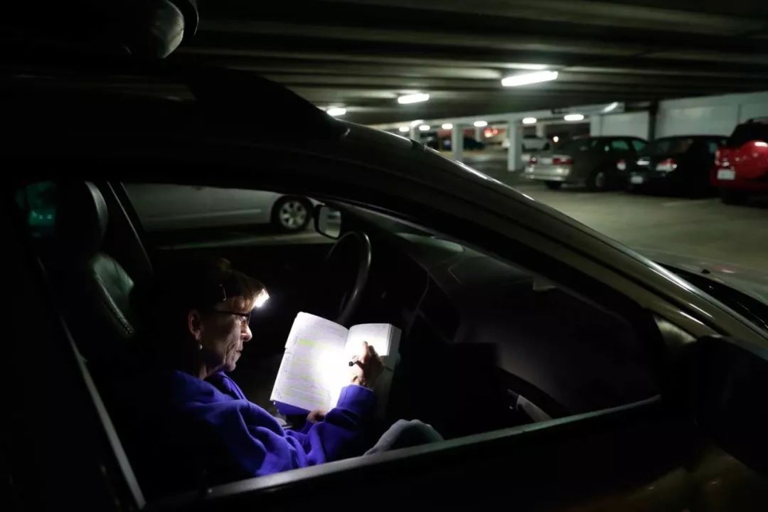Ellen可以驾轻就熟地在「大学教授」和「无家可归的流浪者」两种身份之间无缝切换。白天的她在讲台上探讨英语文学,和所有教职工一样在食堂吃饭;晚上的她戴着头灯窝在副驾驶上备课、判作业,然后在同一个空间里度过整个夜晚。
