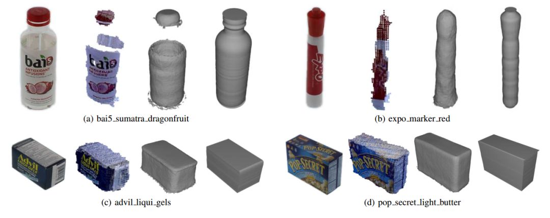 图5:从BigBIRD数据集中提取的样本对象。在每个物体组中,第一列是目标物体的RGB图像。第二列是对象的原始点云。第三列是由BigBIRD数据集提供的地面真值网格。第四列是使用我们的系统建模的对象。请参阅附带的视频和补充材料,以获得我们完整提取的数据。