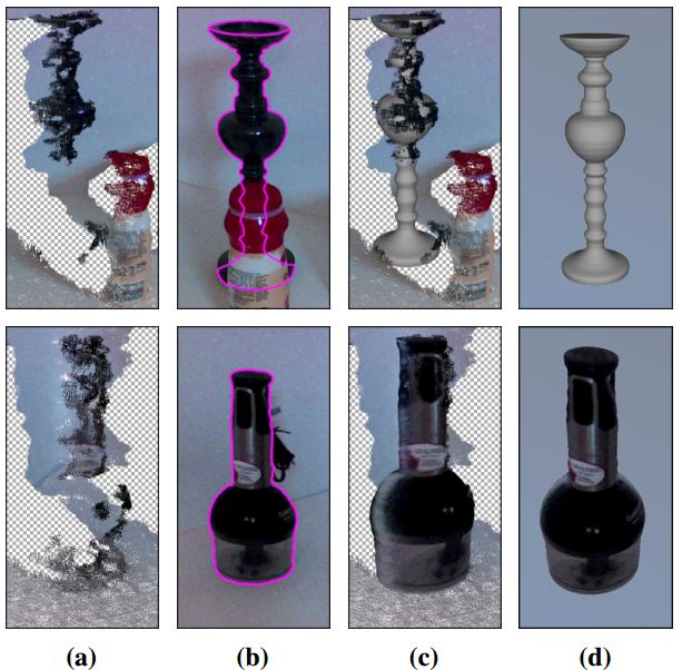 图1:使用GemSketch对遮挡烛台(第一行)和透明研磨机(第二行)进行几何提取。(a)侧向单视点云数据;(b)RGB图像上的用户追踪轮廓(用户可以使用他们直观的判断来跟踪被遮挡的对象部分);(c)叠加在点云上的3D网格;(d)完全提取大规模纹理映射的3D模型。(d)中的研磨机是纹理映射的,方格图案表示缺少点云数据。请注意,在最终结果中,由于平滑,预计会出现与用户输入的小偏差。