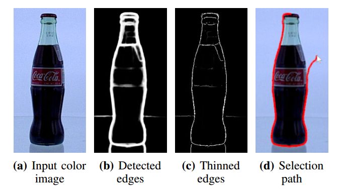 图4:在磁性选择工具所必需的RGB图像上执行的预处理步骤,在(b)中显示输入图像(a)的边缘的检测结果,并且变薄以