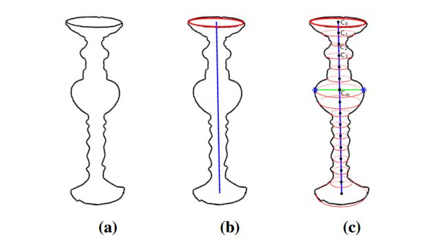 图3:建模广义圆柱体。(a)用户追踪的轮廓;(b)中提取物体的轮廓和中心线;(c)沿着物体中心线按一定的时间间隔传播和按比例调整轮廓。每个Ci表示沿着中心线的复制剖面的中心。复制的轮廓按照比例缩放,这样它们就可以在星号表示的点上贴合用户的笔画