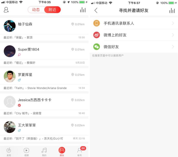 第一,基于熟人关系链形成 。网易云音乐设置通过手机通讯录、微信好友、新浪微博好友等添加好友的途径 ,促使用户将自己固有的关系链中的好友、熟人或喜欢的音乐人转移到网易云音乐中 ,建立稳定的社交圈 ;