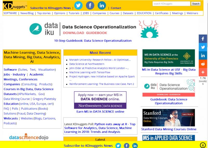 Kdnuggets是一个内容覆盖非常广泛的网站,不论是就职干货还是技术难题,它总会有相关的文章。该网站的文章质量非常高,因此是各大公众号的“兵家必争之地”。建议多挂住网站左下角的“Most Popular”和“Most Shared”里的文章,快捷高效地获取优质文章。