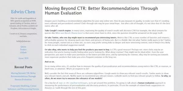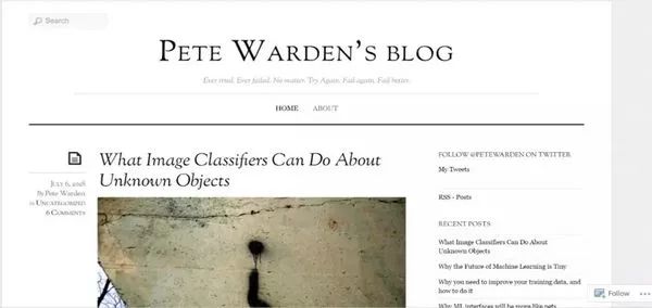 这是技术牛人Pete Warden的个人博客。他的文章更新较慢,但是内容严谨且具权威性。文章大都附有图片和代码进行解释。该网站是一个很好的研究性信息来源,和Google Research Group一样,文章一出,非常容易遭到疯抢。另外,文章的内容比较艰深,同时篇幅长,比较适合学术研究使用。