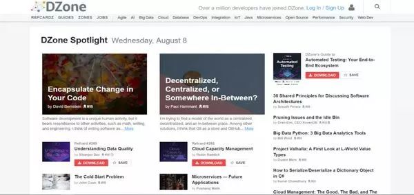 Dzone的内容对于计算机领域的知识覆盖简直让人惊讶,不论是AI、云计算、数据安全还是计算机性能、IoT和网站设计,这网站都有相关的文章,并且分好了类别。该网站的更新速度很快,而且每次都会对各个类别的文章进行大量更新。但是,对于文章质量来讲,还需要认真甄别。