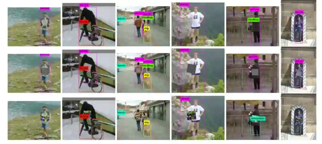 上图所示为在 Inria 测试集中使用不同贴纸的效果对比示例。首先将 YOLOv2 检测器用于没有贴 patch 的图像中(第 1 行),然后是使用随机贴纸(第 2 行)以及生成的最佳贴纸的效果(第 3 行)。在大多数情况下,贴纸能够成功地将人员隐藏在探测器中。如果效果不好,则可能是贴纸没有和人对齐。因为在优化期间,贴纸的中心对齐是仅仅由图像边框确定的。
