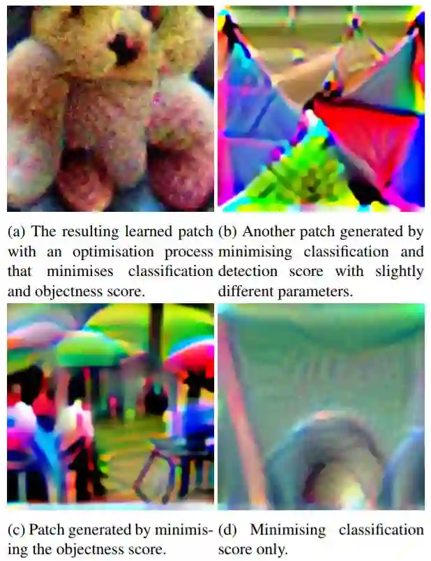 生成的补丁 (patch)能够成功地将人在检测器视线中隐藏起来。例如,这种攻击可能被恶意地用来绕过监视系统,入侵者只要将一小块硬纸板放在身体前面,面向监视摄像头,就能不被监视系统发现。