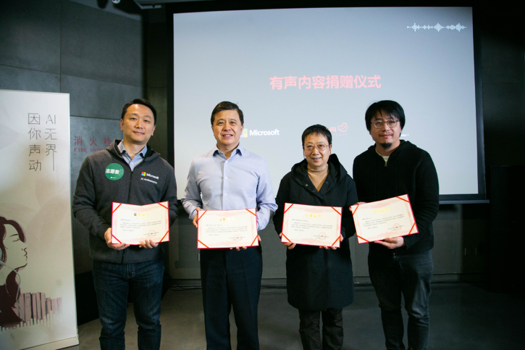 12月2日,微软与周迅 AI 语音红丹丹公益项目发起人——鹿音苑文化传播公司、以及来自微软及各界的150名余志愿者,将创作的首批人工智能有声内容,包括鲁迅、老舍、萧红、朱自清等作家的一系列经典作品、红丹丹文化期刊,正式捐赠给北京市红丹丹视障文化服务中心(下文简称“红丹丹”)“心目图书馆”。红丹丹为微软、鹿音苑文化传播公司及志愿者代表授予志愿者证书。这些作品是基于微软 Azure 云认知服务语音合成平台 Speech Studio 及其丰富的人工智能(AI)语音创作的,其中包括艺人周迅授权的定制声音、红丹丹视障人士播音员董丽娜授权的定制声音,以及多个微软智能语音合成平台声音(如晓晓、云野等)。