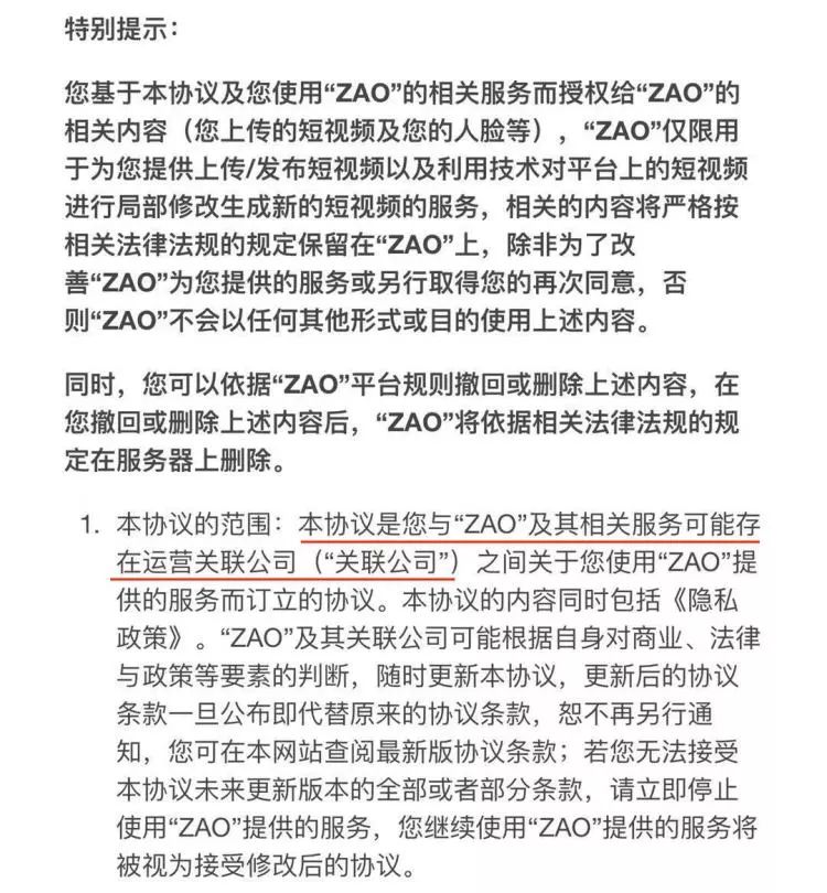 ZAO显然是考虑到了这等风险,才会有明显“甩锅”的霸王用户协议,而且在舆论压力下还修改了关于肖像权授权的措辞,但是并没有更正声明。