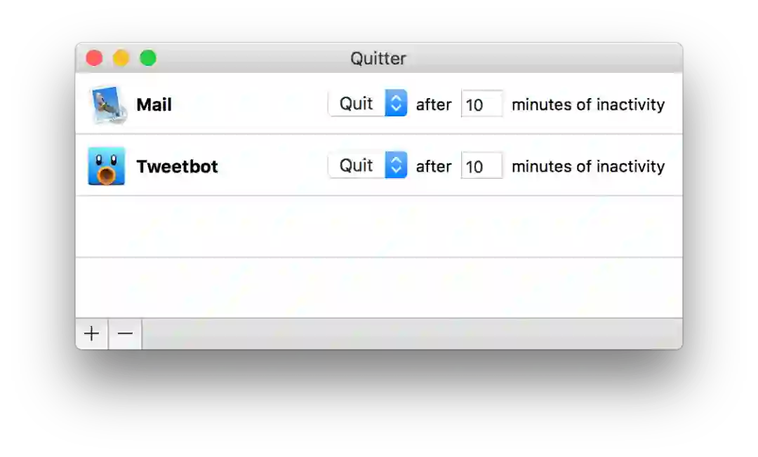Quitter 是 Marco Arment 的作品,在写这个免费的小工具之前,Marco 就有一个脚本用来帮他自动退出一些社交软件。Quitter 的工作方式很简单:我们可以设定,10 分钟后如果没有使用某个软件,就将其退出或隐藏。