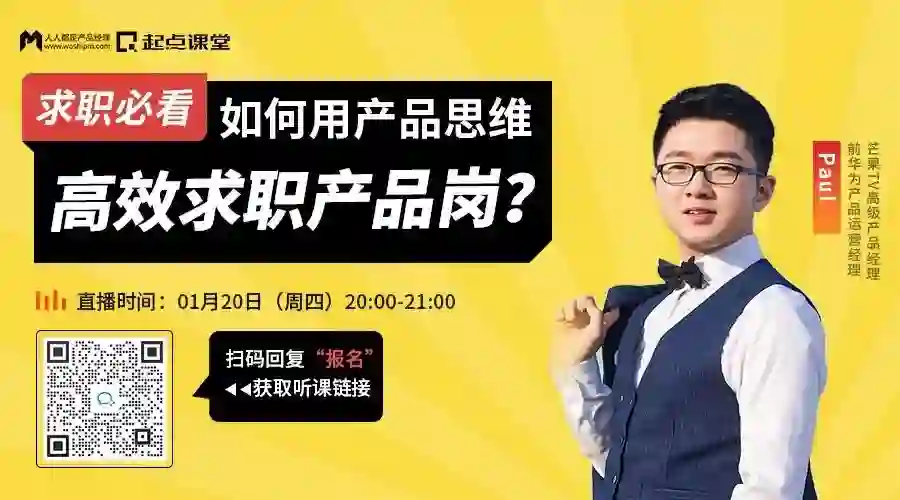 1月20日晚上8点,芒果TV高级产品经理@ Paul,1小时教你从需求分析,产品规划,项目管理,数据分析4个方面着手,用产品思维快速入行产品经理!