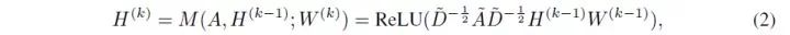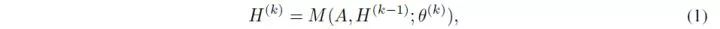 其中 k 表示第 k 次信息传递, 为相应神经网络的参数。在第一次信息传递中,H 就是输入的原始节点特征矩阵 X;在最后一次信息传递中,相应的 H 就作为 Z 输出。比较著名的 GCN 算法的信息传递公式可以写为