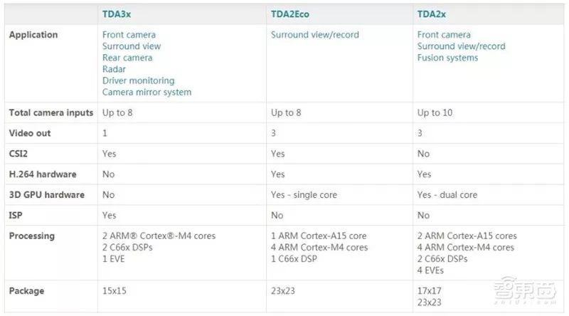 解决方案。TDA2x 于 2013 年 10 月发布,主要面向中到中高级市场,配置了 2 颗ARM Cortex-A15 内核与 4 颗 Cortex-M4 内核、2 颗 TI 定浮点 C66xDSP 内核、4颗 EVE 视觉加速器核心,以及 ImaginationSGX544GPU,主要应用于前置摄像头信息处理,包括车道报警、防撞检测、自适应巡航以及自动泊车系统等。TDA3x于2014 年 10 月发布,主要面向中到中低级市场,其缩减了包括双核 A15 及SGX544GPU,主要应用在后置摄像头、2D 或 2.5D 环视等,可支持车道线辅助、自适应巡航控制、交通标志识别、行人与物体检测、前方防碰撞预警和倒车防碰撞预警等多种 ADAS 算法。