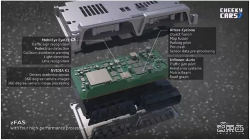 奥迪:Mobileye ASIC+英伟达 GPU+Altera FPGA+英飞凌 MCU 的多芯片集成方案。全新奥迪 A8 公开了自己的 zFAS 控制器方案。zFAS 共有四块高性能的处理器:1)Mobileye 的 EyeQ3 负责视觉信息处理,包括交通标志识别、行人识别、碰撞提醒、车道线检测等;2)英伟达的 Tegra K1 SoC 负责 360°环视影像;3)Altera 的Cyclone 5 FPGA 负责传感器融合、地图融合、辅助泊车等;4)英飞凌的 Aurix 系列 MCU 用于交通拥堵控制、辅助驾驶等。