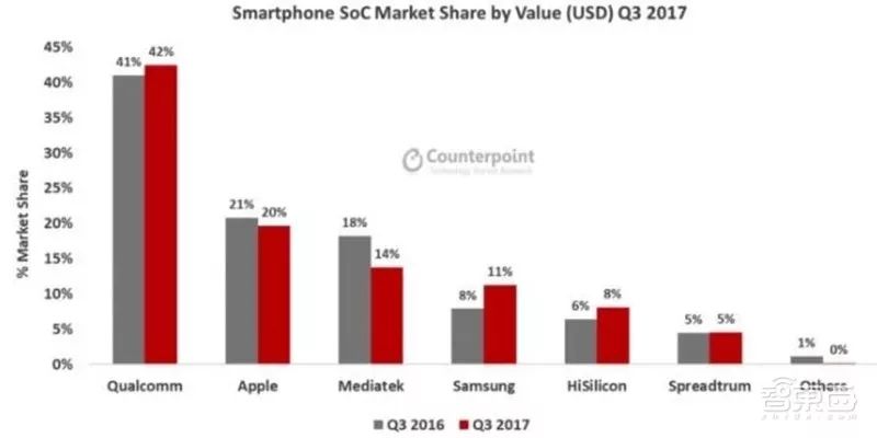 ▲全球智能手机 SoC 市场份额(2016-2017)