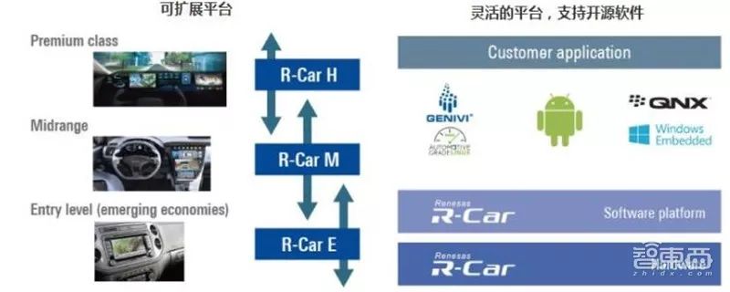 自动驾驶平台:瑞萨推出自动驾驶 SoC R-Car,采用 ARM CPU 和 PowerVR GPU,可扩展的硬件平台可覆盖入门级(R-Car E 系列)、中级(R-Car M 系列)及高级(R-Car H 系列),支持多种开源软件(安卓、QNX、Linux、Windows、Genivi等)。此外,还有车外摄像头芯片(R-Car V 系列)、车内摄像头芯片(R-Car T 系列)、智能座舱芯片(R-Car D 系列)、车联网芯片(R-Car W 系列)等。