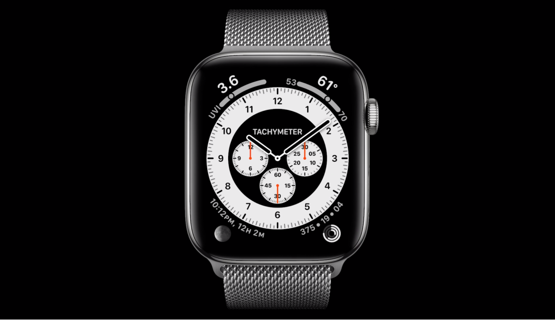 新的 watchOS 7 带来包括「Chronograph Pro」「X-Large」等在内的多款新表盘,前者还自带一个全新的「测速仪」。此外,表盘的「复杂功能」还得到进一步升级,现在有更多「复杂功能」可供选择,而且支持在更多表盘上启用。