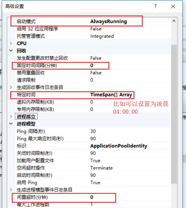 1、先在IIS上设置相应应用程序池的“高级设置”(IIS版本要在8或8以上,要知道IIS10早已出来了,如果你在用IIS很低的版本,然后在报怨IIS,我...),如下图,这样设置后,回收只会发生在凌晨04:00:00