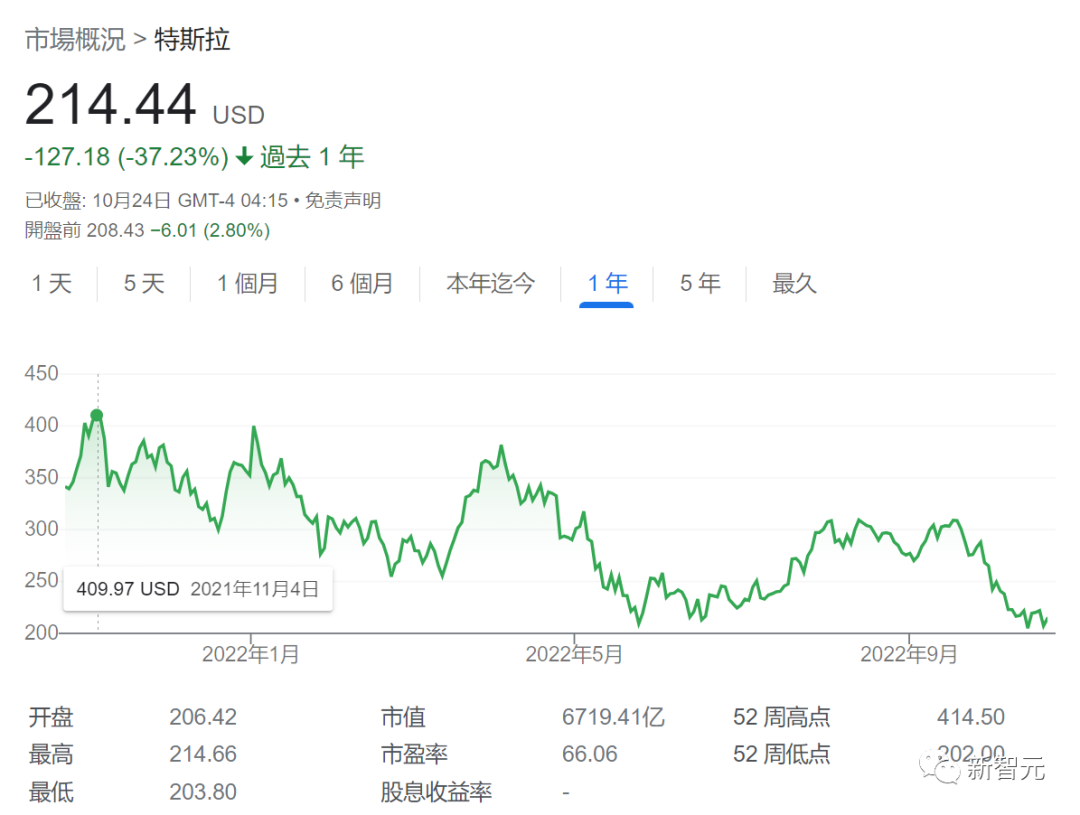 自今年年初以来,特斯拉股价下跌了46%,上周五收于美股214美元,估值为6720亿美元。去年10月,特斯拉估值一度超过万亿美元大关。