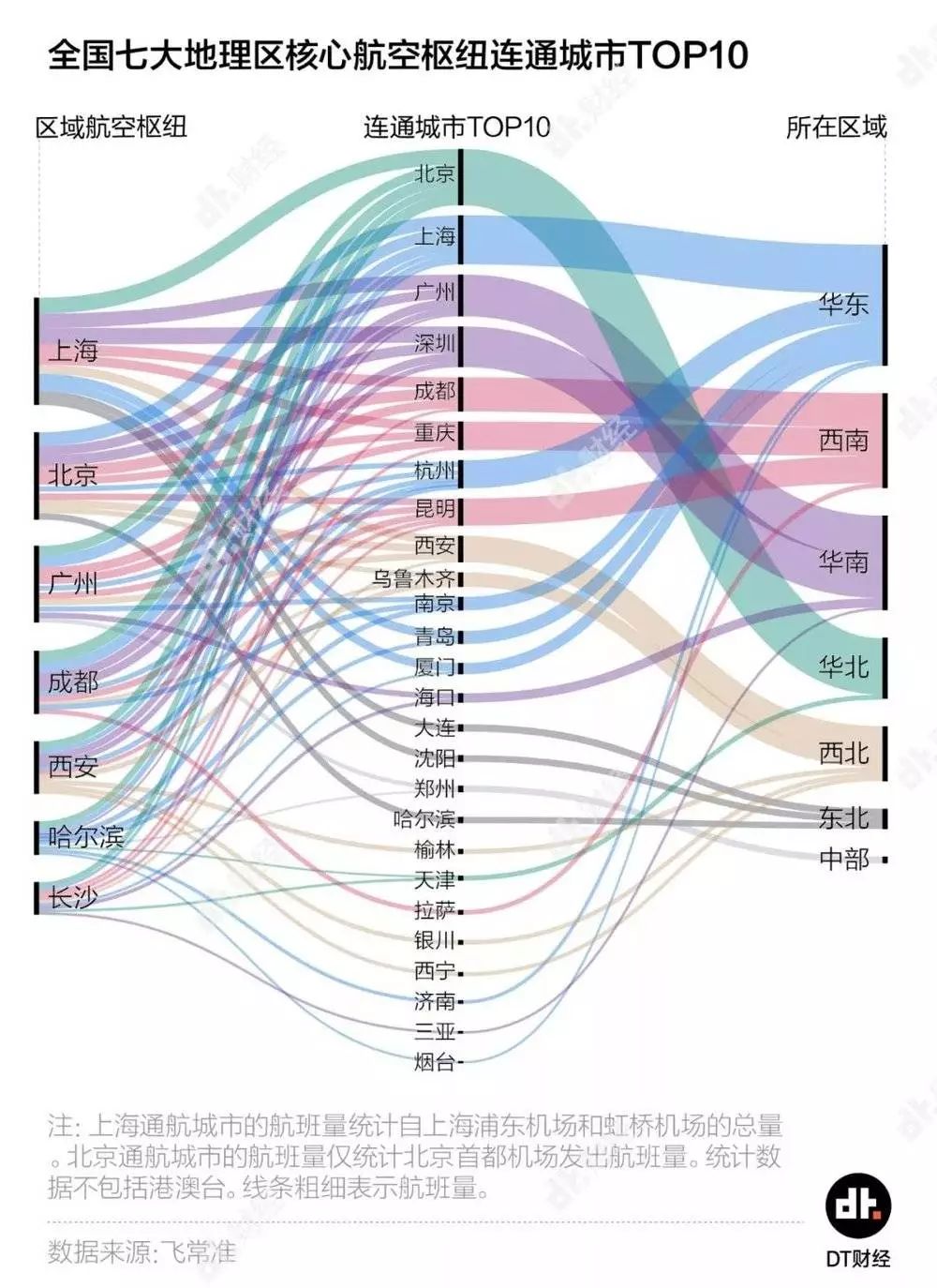站在城市研究的视角,机场吞吐量和航线通达情况一定程度上代表城市商旅活动的活跃程度,进而与城市首位度和经济势能挂钩。DT财经尝试梳理航线与客流相关数据,以此作为描绘中国区域与城市发展立体图景的一个切面,推出系列报道。这是系列的第一篇,我们将告诉你,在航线纵横连接的网络中,哪些城市与城市群机场拥有更高的枢纽地位。