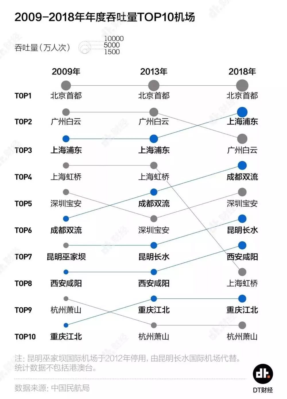 如果以吞吐量来粗论城市的江湖地位,那么过去十年顶级大佬的圈层并没有发生什么变化。2018年的年度吞吐量TOP 10机场仍旧与2009年一样,一线城市北上广深占去5席,西部的成都、昆明、西安与重庆4城稳中有升,仅余末位落到了杭州。