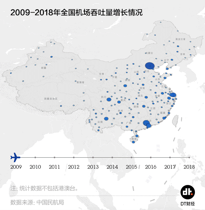 2009年至2018年十年间,中国新增了69个民航机场,旅客总吞吐量增长了1.6倍。2018年,全国吞吐量过千万人次的城市已经达到37个,而北京首都机场的旅客吞吐量终于突破1亿人次,成为继美国亚特兰大机场后,全球第二个旅客吞吐量过亿人次的机场。