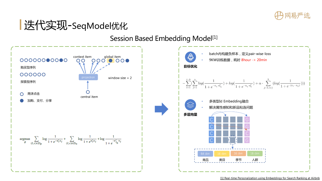 在此之上,我们做了一些loss function的优化,包括去除负采样的过程、在batch内构建pair-wise loss,能大幅提升训练速度;同时也引入多层向量,多层向量是side-info embedding的思路,对Item做向量表征的时候不仅仅利用它的id类特征,还会引入商品的属性、类目、适用季节、适用人群等特征以进一步提升向量表征的效果,同时还能缓解新Item冷启动表征的问题。