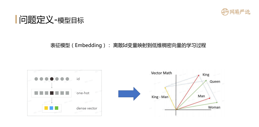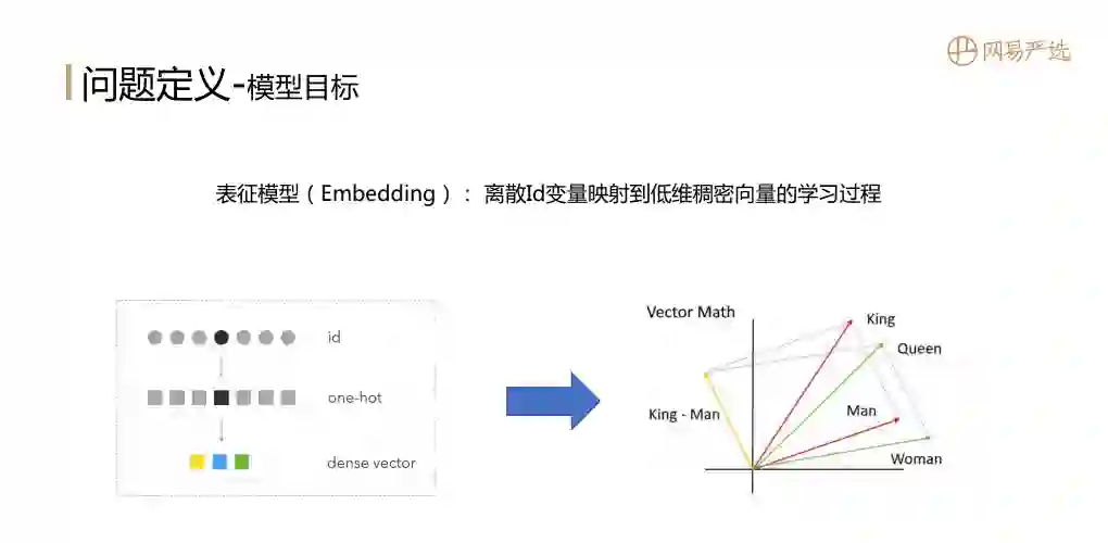 首先说一下问题的定义,就是模型的目标是想做什么?表征模型 ( Embedding ):是将离散id变量映射到低维稠密向量的学习过程。用离散id做特征时一般先做one-hot编码,然后再映射成dense vector。Embedding的目标是在大数据中体现相关性的主体,通过Embedding向量表征学习到主体的向量信息,使用向量度量公式也能体现出主体间的相关性,比如右边这个例子,红色线表示King和Man,假如这个King和Man都已经训练出一个向量表征的结果,我们希望King和Man的内积要大于Queen和Man的內积,这样就得到一个Embedding的目标。