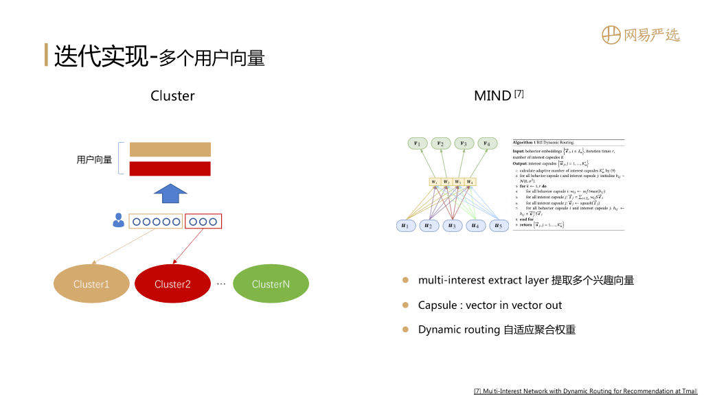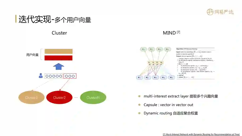 第二种思路是MIND:它利用胶囊网络来形成多个兴趣向量,结构中有一个multi-interest extract layer负责提取多个兴趣向量,图示中u1、u2是用户行为序列中item的向量,他们作为胶囊网络的输入,v1、v2是用户的多个兴趣向量也是胶囊网络的输出。同时胶囊网络还支持动态路由,多次迭代自适应的得到聚合权重。