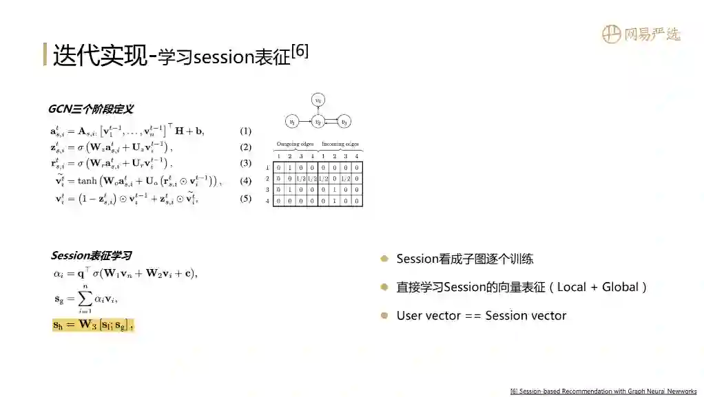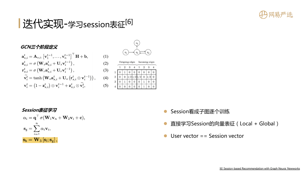 我们当然希望通过图模型得到用户的向量。用户的行为基于session来表示的,如果有一个方法能直接对session进行向量表示,那就可以直接得到行为序列下的用户向量。下图中的论文就是通过学习session向量的表示来解决这个问题,它同时也有GCN三个阶段的定义,在定义过程中还引入了门的参数来设置最终向量的表示过程。最有价值的点是它做了session的表征学习,在训练过程中每个session看成子图进行逐个训练,然后用local向量 ( session中最后一个item向量 ) 加上global向量 ( session中其他item向量经过attention聚合得到一个global向量 ) 来作为session向量,最后用session向量来代表用户向量。在离线评估中这个模型的效果是较为突出的。