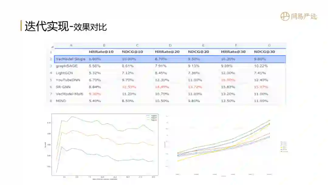 在我们场景数据中,graphSAGE作为GCN的一个工业落地实现指标并不突出,在NDCG@30时略微超出基线模型。LightGCN是通过缩减数据来适配目前已有的最大锅,进而生产出最大的饼;LightGCN以矩阵方式去做向量表征学习,相比基线模型效果也不是特别突出,只在个别指标HitRate@30上有一些提升。YouTubeDNN在4个指标上都有较为明显的提升。SR-GNN是直接对session做用户向量表征,通过模型参数学习求得用户向量,也是目前离线效果最好的模型。VecModel-Multi是在序列模型的基础上,增加聚类的用户多兴趣向量表示,MIND是基于胶囊网络的多兴趣向量模型;在我们数据实验中,VecModel-Multi要比MIND的效果更好。