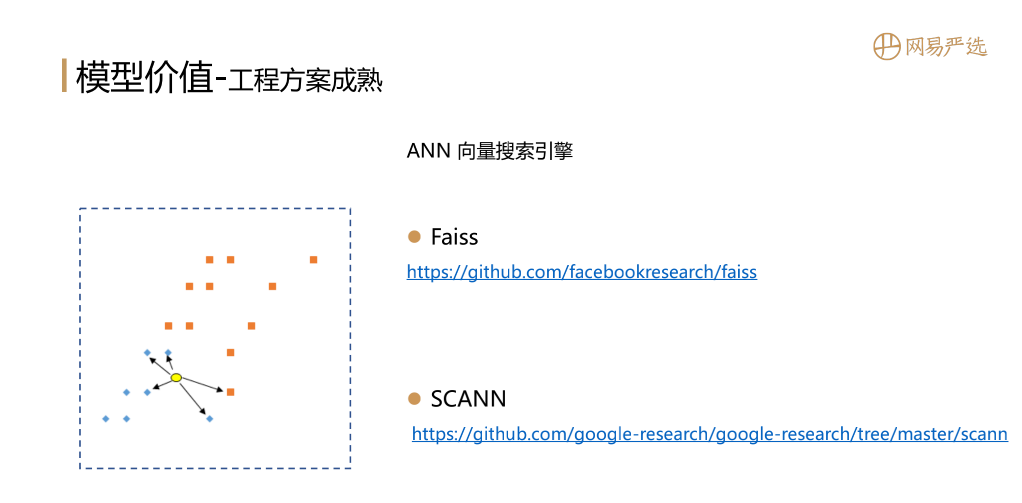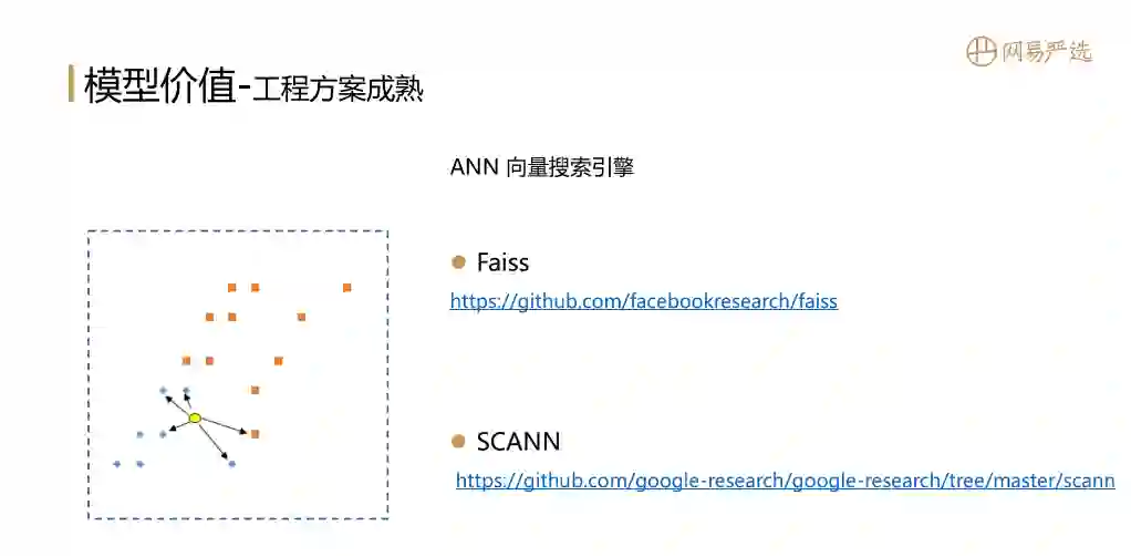 Embedding向量已经有了,还需要向量搜索引擎来将向量推到线上使用,具备online的响应能力。基于向量搜索引擎提供的接口可以找到与给定向量内积最大的或距离最近的TopN个向量。第一个是Facebook较早提出的Faiss的方案,第二个是Google提出的SCANN的方案;这两个方案都很好,能大幅降低工程门槛。