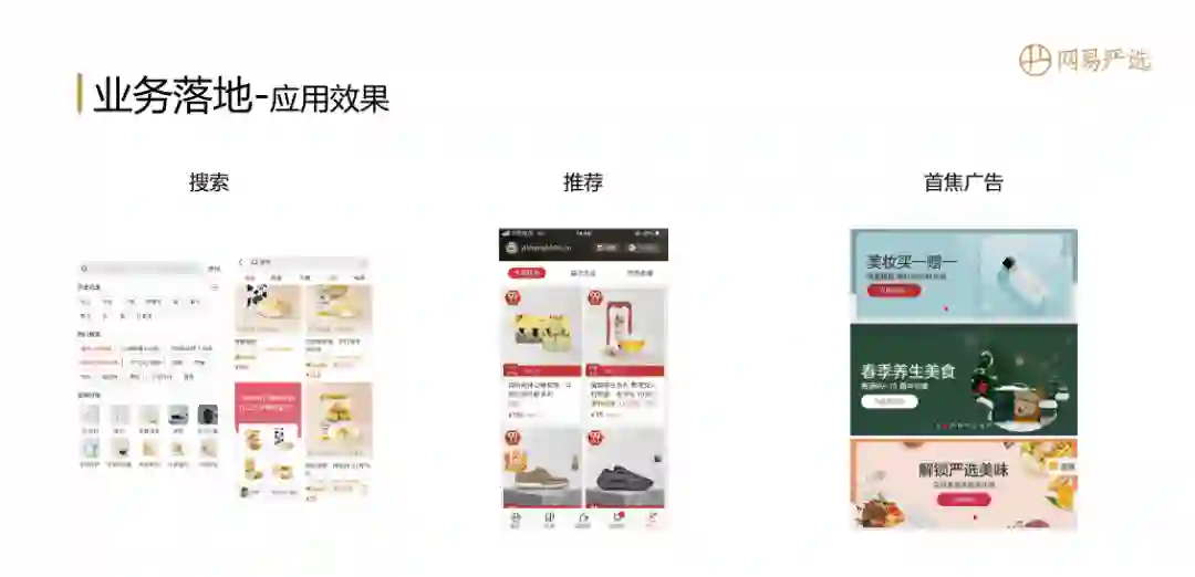具备万物都已向量化的基础后,下面是一些具体应用的落地效果示意。比如搜索中搜索词的推荐 ( U2Q )、搜索结果语义匹配 ( Q2I ),推荐中很多简单场景可以直接使用基于向量的排序模型,效果也不错。还有内部首焦广告中的智能合图,通过User2Topic,User2Item挑选用户最感兴趣的活动商品呈现个性化Banner。