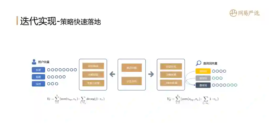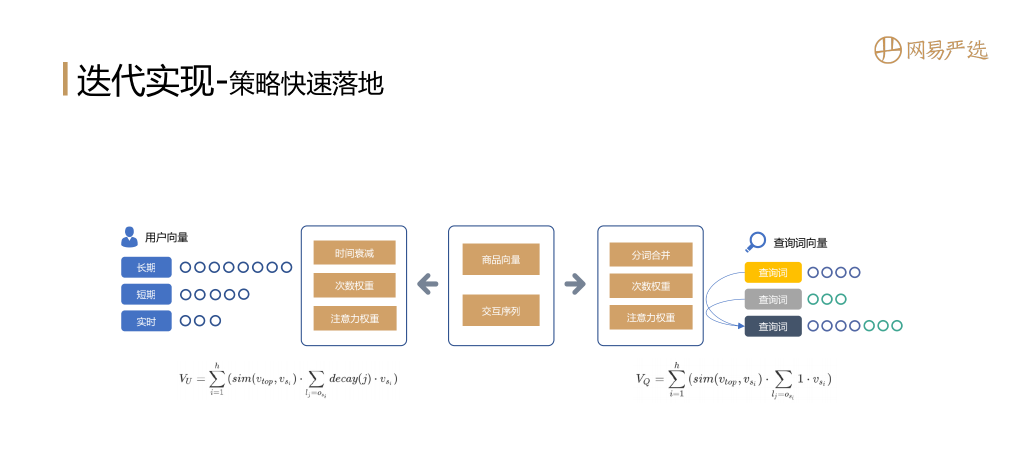 策略是能快速落地的方案,是一个很好很稳定的baseline。我们可以利用已知的商品隐向量和session中用户的交互行为序列,基于时间衰减、次数权重和注意力机制来得到用户的向量表征。同样的在搜索场景下也可以通过查询词的分词合并、次数权重、注意力权重得到查询词的向量表征。