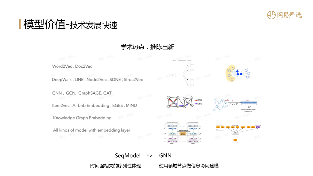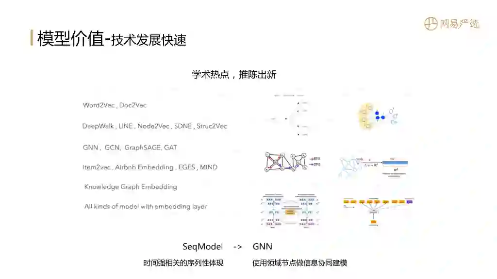 向量表征是学术圈的热点,不断推陈出新,特别是GCN ( 图卷积神经网络 )、GNN ( 图神经网络 ) 都很火,学术界每年都发表很多paper。学术研究快速发展附带的技术红利能给业务带来增量价值。接下来我们会从两个方向去聊向量表征的模型,一个是序列模型SeqModel,另一个是图网络模型,这两种模型都能解决向量表征的问题。那在选择模型的时候到底该选两类模型的哪一个?这个是与产品数据是强相关的,如果产品数据具有时间强相关性,用序列模型效果肯定不会差;如果产品数据的节点比较稀疏,需要用邻域节点做信息协同建模,这时候建议尝试下GNN。图数据几乎可以纳入任何场景产生的数据关系,所以GNN是一个普适性很高的通用模型方案,但是并不意味着在所有场景GNN都比序列模型好,实验出真知不同场景下需要多种方案对比。接下来基于我们搜索推荐业务场景的结论,与大家分享下序列模型和GNN模型的迭代。