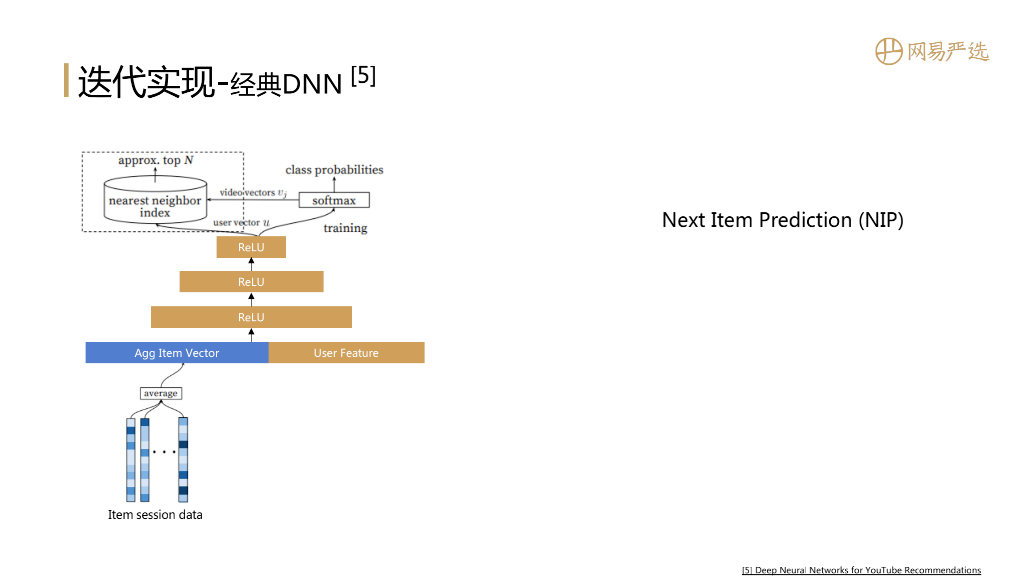 接下来还有一个经典模型DNN,直接通过模型得到用户的向量。参考图中YouTube的这篇经典论文,模型本质上是一个有监督的NextItemPrediction训练过程,用户的Item session data,做一个简单average聚合,再加上user feature作为深度模型的输入特征数据。输入特征数据经过层层传播,到达最后一层得到用户向量,用户向量和item向量做softmax,完成一个概率分布的预测,也就得到了模型的loss。模型训练完成后同时得到User和Item的向量表示。