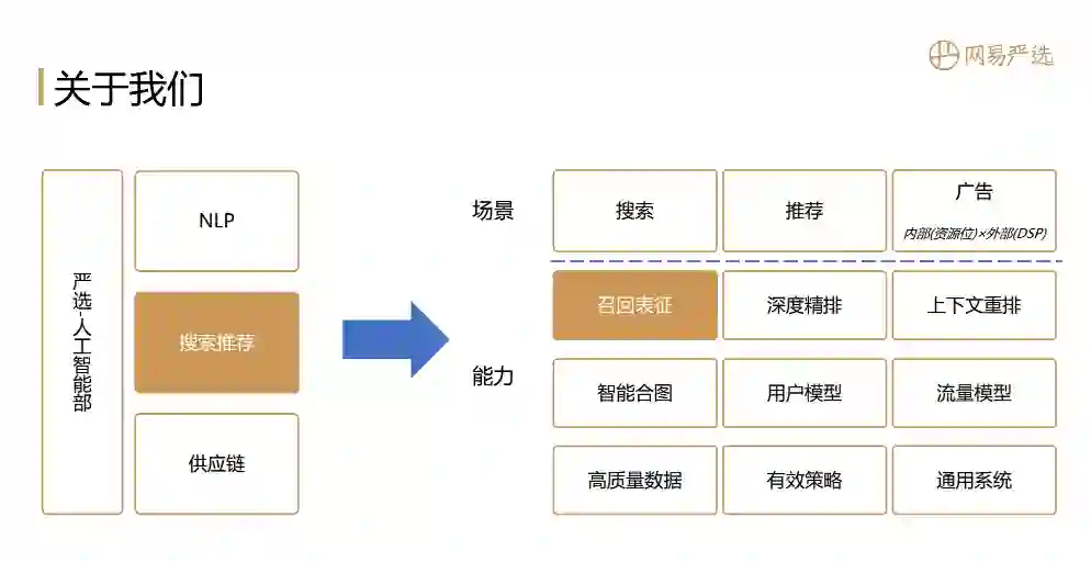 如图所示,在这些个性化场景下是我们具备的能力矩阵。刚接到邀请的时候我是想聊一聊在严选业务场景下的个性化相关事情,但是我们业务基本都做了2~3年,想在短时间聊完,只能介绍我们做了哪些工作以及取得什么样的业务价值。但是每个人的业务场景差异较大,我们这边最优的实现方案在其他场景可能并不是最优方案,大家听完之后,可能没有太大的收获。与其这样,还不如聚焦在一个小模块上详细聊一下,所以今天就选召回表征这个部分,也就引出了本次分享主题:"全能选手"召回表征算法实践,主要内容包括: