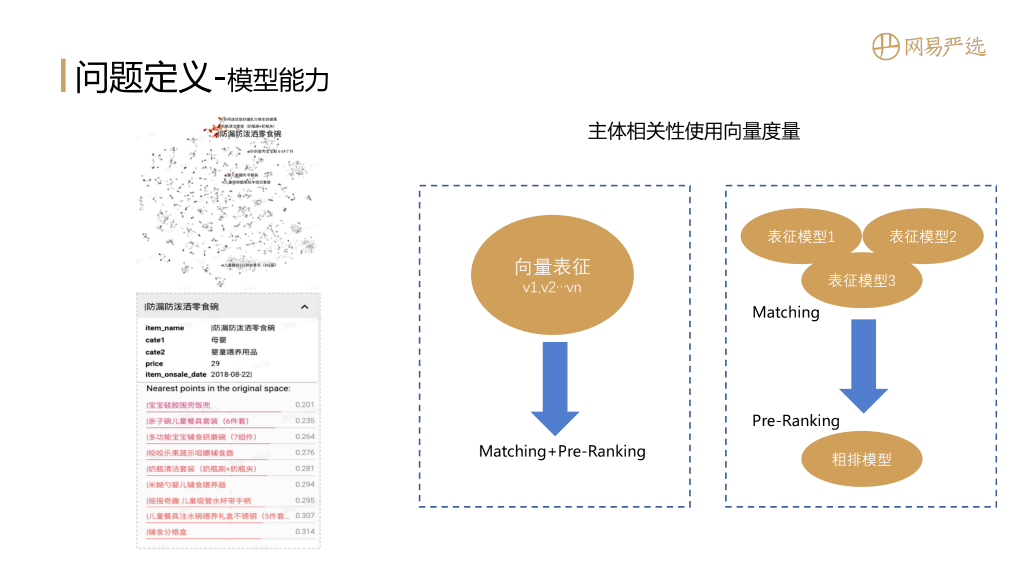 当模型训练出来后,主体的相关性是可以用向量相似度来衡量的,下图是一些item的表征形式,如果几个item相似,那么他们的距离就比较小,内积比较大,比如和零食碗相似的都是一些相同类目下的商品。如果我们只有一个向量表征模型,那么模型的Embedding既可用于召回,也可以利用两个item的Embedding向量內积来作为粗排的依据,这样召回和粗排两个场景可以一次搞定。但是大多数情况下会存在多种表征模型,每种表征模型都会去做召回,这种情况下需要引入粗排模型将多个表征模型的召回结果进行合并、排序。用于合并的粗排能力可以策略结合蒸馏模型,这里先不展开介绍。