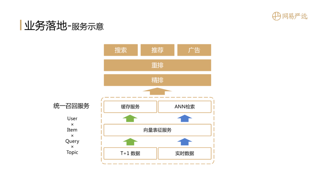 图中是一个简单的服务示意图,整体是整合的统一召回服务,其中核心向量表征服务具备User、Item向量表征的能力,它可以采用T+1的数据做表征,也可以利用实时数据做用户实时兴趣的表征。统一召回服务的输出经过精排、重排就可以应用到搜索、推荐、广告等业务场景中了,所以召回服务是各个业务的基石,召回效果的提升能带来多个场景效果的提升,是一个产出投入比非常高的技术方向。