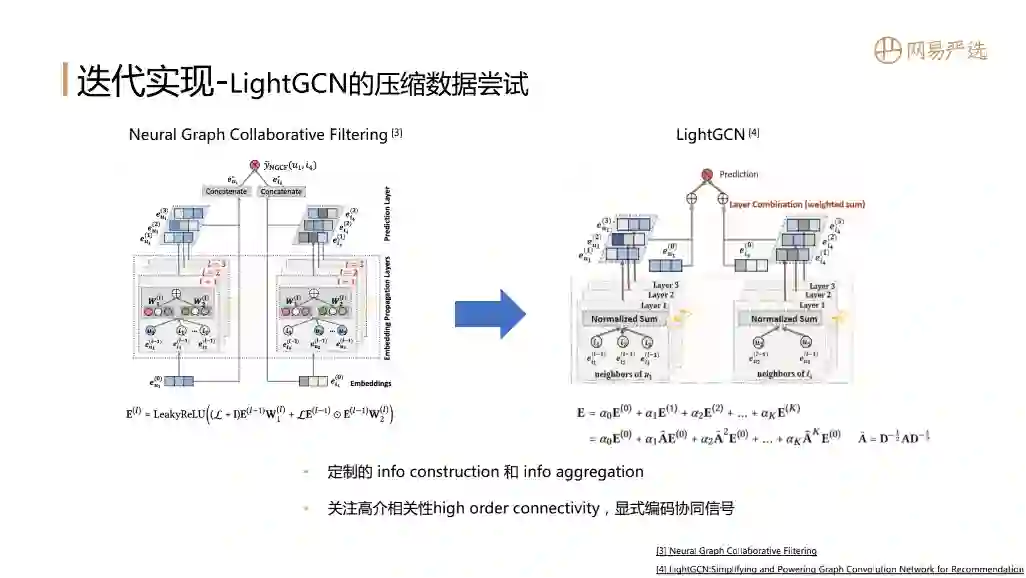 GCN需要一个大矩阵计算过程,相比工程化的思路二者效果有多少差异?能否缩减现有数据实现GCN和其他模型做一个对比?所以我们就实现了一个LightGCN,主要是参考了图中的两篇论文。两篇论文出自同一团队,论文定制信息的构建和聚合过程,能够捕捉结点的高阶相关性,显式的编码协同信号。一般GCN的网络深度不会超过2,而这里的LightGCN能做到三层,这里面的节点已经涵盖了user、item。本文最后会对所有的效果做一下对比。从知识表达上这两篇论文写得很好,大家可以去研读下,会对GCN有更好的认知。