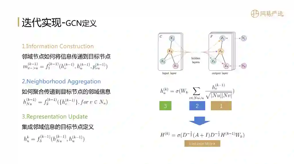 目前很多关于GNN的paper,都会有关于这三个阶段的定义,图右边是GCN的一个示意图,图中的公式就对应三个阶段,而且非常巧妙是这个公式可以转化为矩阵运算形式,可充分利用GPU的算力。但是这个矩阵结点数是 ( #users+#items ) × ( #users+#items ),size大到工业界难落地。