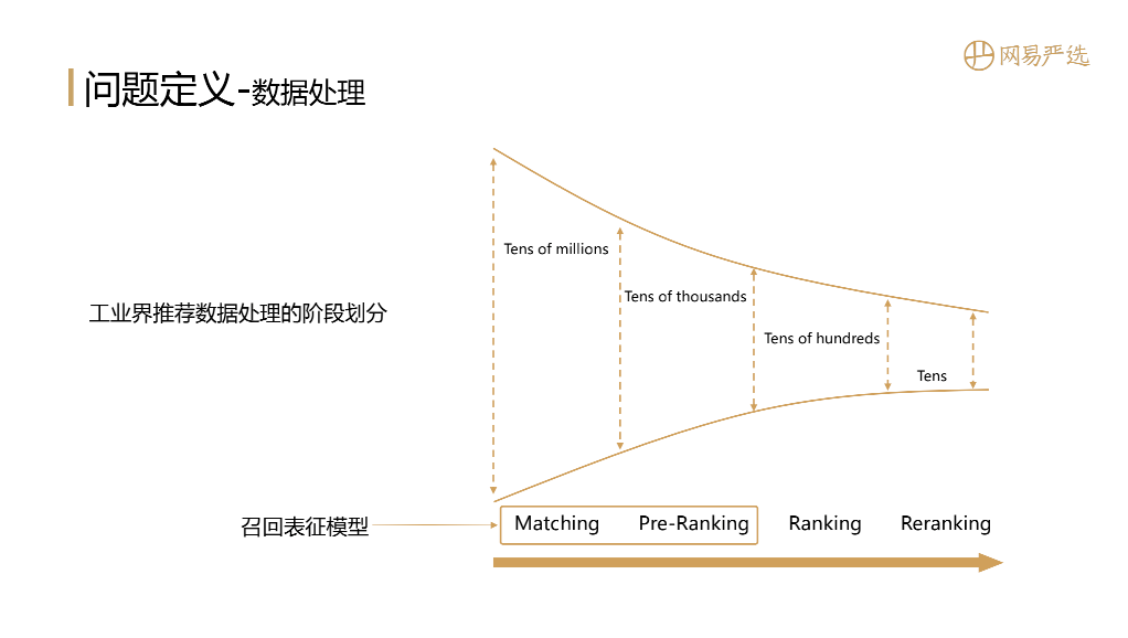 其实Embedding是一个非常通用的模型用于主体的学习和表达,它在NLP、搜索、推荐、图像中都有广泛应用。那么到具体业务场景在搜索推荐中Embedding到底是如何发挥作用的?下面这个图是一个非常经典的工业界推荐数据处理的阶段划分,从左到右是一个数据逐层递减的过程,依次是召回 ( Matching )、粗排 ( Pre-Ranking )、精排 ( Ranking )、重排 ( Reranking )。那我们的召回表征模型的作用范围主要是召回和粗排两个阶段,它在搜索推荐中起到基石的作用。